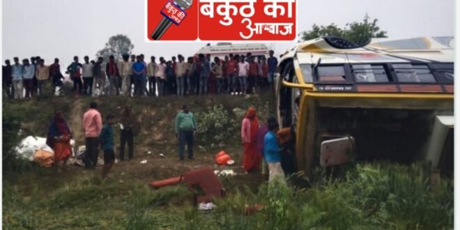 यात्रियों से भरी बस पलटी बस में तीर्थ यात्रा कर रहे हैं घायल व्यक्तियों को राजेपुर सामुदायिक स्वास्थ्य केंद्र भेजा गया