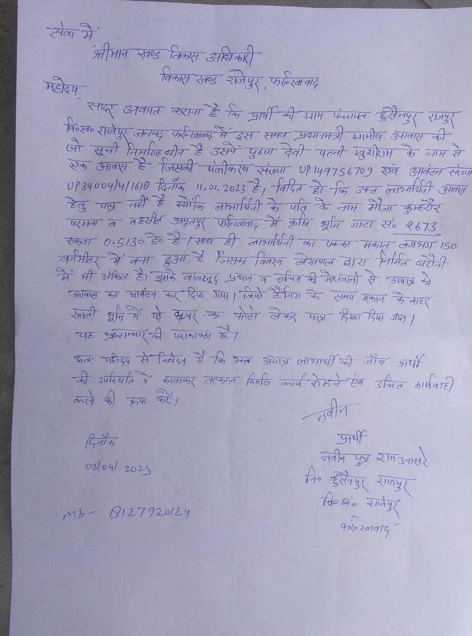 अपात्र आवास की शिकायत खंड विकास अधिकारी से करते हुए प्रार्थना पत्र में दर्शाया गया है कि सचिव प्रधान की मनमानी से विकासखंड राजेपुर क्षेत्र के ग्राम पंचायत हुसैनपुर राजपुर मै इस समय प्रधानमंत्री ग्रामीण आवास की जो सूची निर्माणाधीन है उसमें पुष्पा पत्नी खुशी राम के नाम से एक आवास है जिसकी निष्पक्ष जांच की जाए जिसको लेकर ग्रामीणों ने विरोध किया साथी ही ग्राम पंचायत में गरीब असहाय विकलांगों की झोपड़ी पर क्यों नहीं पड़ती है सचिव व प्रधान की नजर लिखित प्रार्थना पत्र में दर्शाया गया है कि पुष्पा खुशीराम के नाम जो आवास आवंटित किया गया है वह प्रधान व सचिव ने अच्छा धन लेकर अपात्र से पात्र की सूची में स्वीकृति प्रदान की गई है जिसका पक्का मकान लगभग 150 मीटर में बना मौके पर मौजूद है वही कई एकड़ भूमि भी है जियो टेक्निक के समय समझदारी से पुष्पा देवी को खाली पड़ी जमीन में झोपड़ी डलवा कर फोटो खिंचवा लिया गया पात्र की सूची में शामिल है शिकायतकर्ता ने बताया है कि वह गांव में नवीन प्रति सरकारी भूमि पर भी अवैध कब्जा जमाए हुए हैं जानवरों का अच्छा व्यापारी भी है टू व्हीलर वाहन भी मौके पर मौजूद है निष्पक्ष जांच कराने को प्रार्थना पत्र दिया दबंग किस्म के व्यक्ति पर ही क्यों मेहरबान सचिव और प्रधान शासन की मंशा पर पलीता लगा रहा है