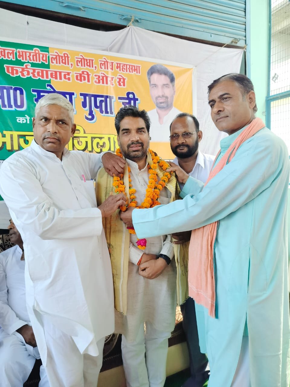 अखिल भारतीय लोधी लोध महासभा की ओर से भारतीय जनता पार्टी के नवनियुक्त जिलाध्यक्ष रूपेश गुप्ता का भव्य स्वागत समारोह सेंट्रल जेल चौराहे के पास बेचेलाल वर्मा के आवास पर जवाहरलाल राजपूत की अध्यक्षता में व रामाधार वर्मा के संचालन में संपन्न हुआ , स्वागत समारोह में मुख्य अतिथि जिला अध्यक्ष रूपेश गुप्ता भव्य स्वागत से अभिभूत अपने को गौरान्वित व गदगद महसूस करते हुए लोधी समाज के लिए हर समय कदम से कदम मिलाकर रहता हूं , उन्होंने कहा कि सनातन के पुरोधा बाबू जी कल्याण सिंह ने सर्व समाज के लिए जो अविस्मरणीय कार्य किये जिसे भुलाया नहीं जा सकता , उन्होने मौजूद लोगों को खुद माला पहनाकर सम्मानित किया , आज समारोह में प्रमुख रूप से संरक्षक बेचेलाल वर्मा , प्रदेश महामंत्री परशुराम वर्मा , जिला अध्यक्ष महेश चंद्र राजपूत , महामंत्री राम लडैते राजपूत , वरिष्ठ महामंत्री अरविंद राजपूत , रामगोपाल वर्मा नवीन राजपूत , अनिल राजपूत, कुशपाल सिंह राजपूत , अमर सिंह राजपूत, नरेश चंद्र राजपूत लक्ष्मीकांत राजपूत , सुधीर वर्मा रिंकू , संजय राजपूत , राकेश सिंह राजपूत, अजय पाल सिंह राजपूत , रोशन लाल राजपूत, कालिका प्रसाद राजपूत , प्रवीन वर्मा , अजय राजपूत फौजी , भाजपा नेता डा धर्मेन्द्र राजपूत , प्रो के के राजपूत , मगन लाल वर्मा आदि मौजूद रहे