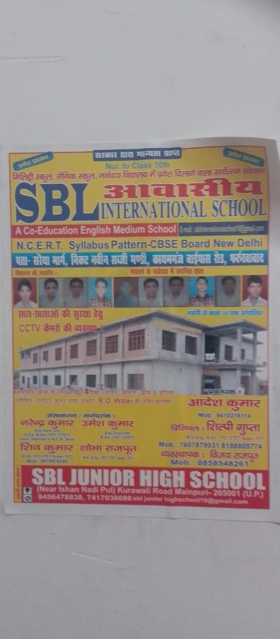 फर्रुखाबाद एसबीएल आवासीय विद्यालय सरैया मार्ग निकट नवीन सब्जी मंडी कायमगंज बाईपास रोड फर्रुखाबाद आवासीय विद्यालय कार्यक्रम का आयोजन किया गया जिसमें बच्चों ने कविताएं व संगीत देशभक्ति गीत सुनाएं व बच्चों ने बढ़ चढ़कर भाग लिया कार्यक्रम के मुख्य अतिथि ब्लॉक प्रमुख बढपुर शैलेंद्र राठौर उपस्थित रहे SBL विद्यालय 2014 से शिक्षा कार्यरत्त है जो कि बच्चों को शिक्षा जगत में बच्चों को उच्च शिक्षा प्रदान कर रहा है जिसमें बच्चों को खाने-पीने रहने विशेष सुविधा उपलब्ध है आवासीय विधालय नर्सरी से लेकर कक्षा 8 तक शिक्षा दिलाई जाती है जिसके पढ़े लिखे बच्चे सरकारी नौकरी पा सकते हैं विद्याज्ञान व नवोदय सैनिक की विशेष तैयारी कराई जाती हैं जिसमें बीटीसी ,बीएड किए हुए अध्यापकों से शिक्षा प्राप्त कराई जाती है जो की एसबीएल विद्यालय की एक शाखा मैनपुरी कुरावली रोड यशवंत नदी के स्थित है वहां पर बच्चों को नर्सरी से लेकर 10th तक उचित शिक्षा उपलब्ध कराई जाती है वह रहने खाने की उच्च व्यवस्था है बच्चों को सीसीटीवी की कैमरे की निगरानी में रखा जाता है