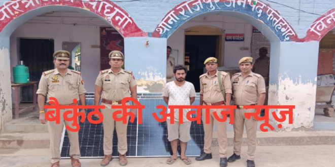राजेपुर थाना क्षेत्र के ग्रामसभा जैनापुर के मजरा बकसपुर महेशपुर निवासी सतेन्द्र कुमार पुत्र स्वर्गीय प्रेम चन्द्र ने सोलर प्लेट चोरी किये जानें का मुकदमा दर्ज कराया था विवेचना उपनिरीक्षक अजय सिंह कर रहे थे पुलिस नें बीती रात तीन चोरी की गई सोलर प्लेट सहित आरोपी शशांक उर्फ अंकित शुक्ला पुत्र सूर्य प्रकाश को गिरफ्तार किया है प्रभारी निरीक्षक योगेन्द्र सिंह सोलंकी नें बताया की 9 सोलर प्लेट चोरी हुई थीं जिनमे से तीन को बरामद किया गया है और जांच की जा रही है
