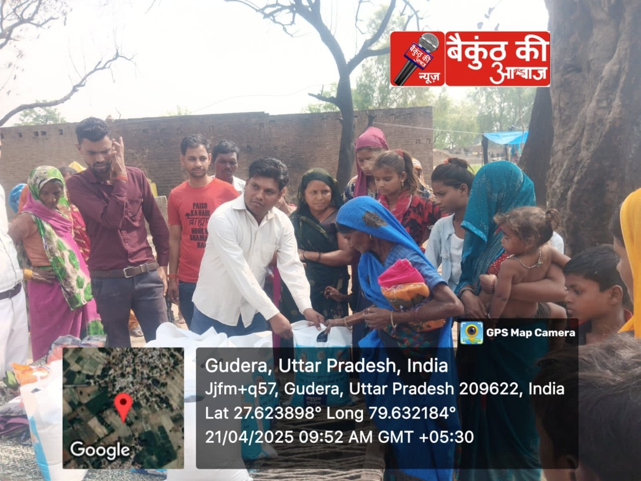 अमृतपुर थाना क्षेत्र के गांव गुडेरा में कुछ दिनों पहले आग ने अपने विकराल रूप से कई घरों को जलाकर राख कर दिया था जिस मे घर गृहस्ती का सारा सामान जलकर राख हो गया था यह देखते हुए अन्नदाता किसान देव कल्याण फाउंडेशन के संस्थापक ब चेयरमैन अमन अवस्थी ब रतनपुर पमारान के पूर्व प्रधान लालू कुशवाहा ने कपड़े ब खाद्य सामग्री वितरित की, और लाइट की व्यवस्था करवाई, रमेश यादव पुत्र जंगी, रामनिवास राजपूत पुत्र लल्लू , अशोक राजपूत पुत्र लल्लू ,बोदिल पुत्र रामऔतार लोगो का घर गृहस्ती का सारा सामान जल गया था तभी अन्नदाता किसान देव कल्याण फाउंडेशन के संस्थापक ब