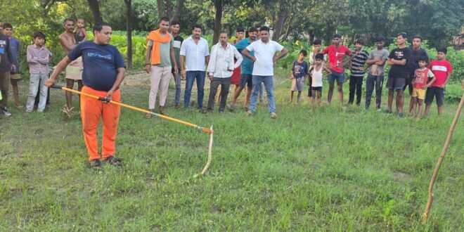 थाना कम्पिल क्षेत्र के गांव बिल्हा में जहरीला सांप देख ग्रामीणों में हड़कंप मच गया। जब खेतों में एक दुर्लभ और अत्यंत जहरीले सांप को रहते हुए देखा गया ग्रामीणों के अनुसार यह सांप आम सांपों से अलग दिख रहा था और पहली बार ग्रामीणों ने ऐसा सांप देखा। सांप को देखकर मौके पर काफी मात्रा में ग्रामीणों की भीड़ लग गई लोगों ने तत्काल इसकी सूचना गौ सेवा टीम कम्पिल व वन विभाग को दी सूचना पर पहुंचे गौ रक्षा दल के जिला सचिव ठाकुर युवराज सिंह व उनकी गौ सेवा टीम कम्पिल व वन विभाग की टीम ने सावधानी पूर्वक सांप को पकड़ लिया गौ रक्षा दल के जिला सचिव ने बताया कि पकड़ा गया सांप रसियन बाईपर प्रजाति का है जो अत्यधिक विषैला होता है विभागीय अधिकारियों के अनुसार यह सांप कोबरा से भी ज्यादा जहरीला होता है और इसके काटने से चिकित्सा के अभाव में जान का खतरा बढ़ जाता है वन विभाग व गौ सेवा टीम कंपिल ने ग्रामीणों से अपील की है कि यदि इस तरह का कोई और सांप दिखे तो खुद से पकड़ने की कोशिश ना करें बल्कि तुरंत विभाग को सूचित करें फिलहाल पकड़े गए सांप को सुरक्षित स्थान पर ले जाकर छोड़ने की तैयारी की जा रही है