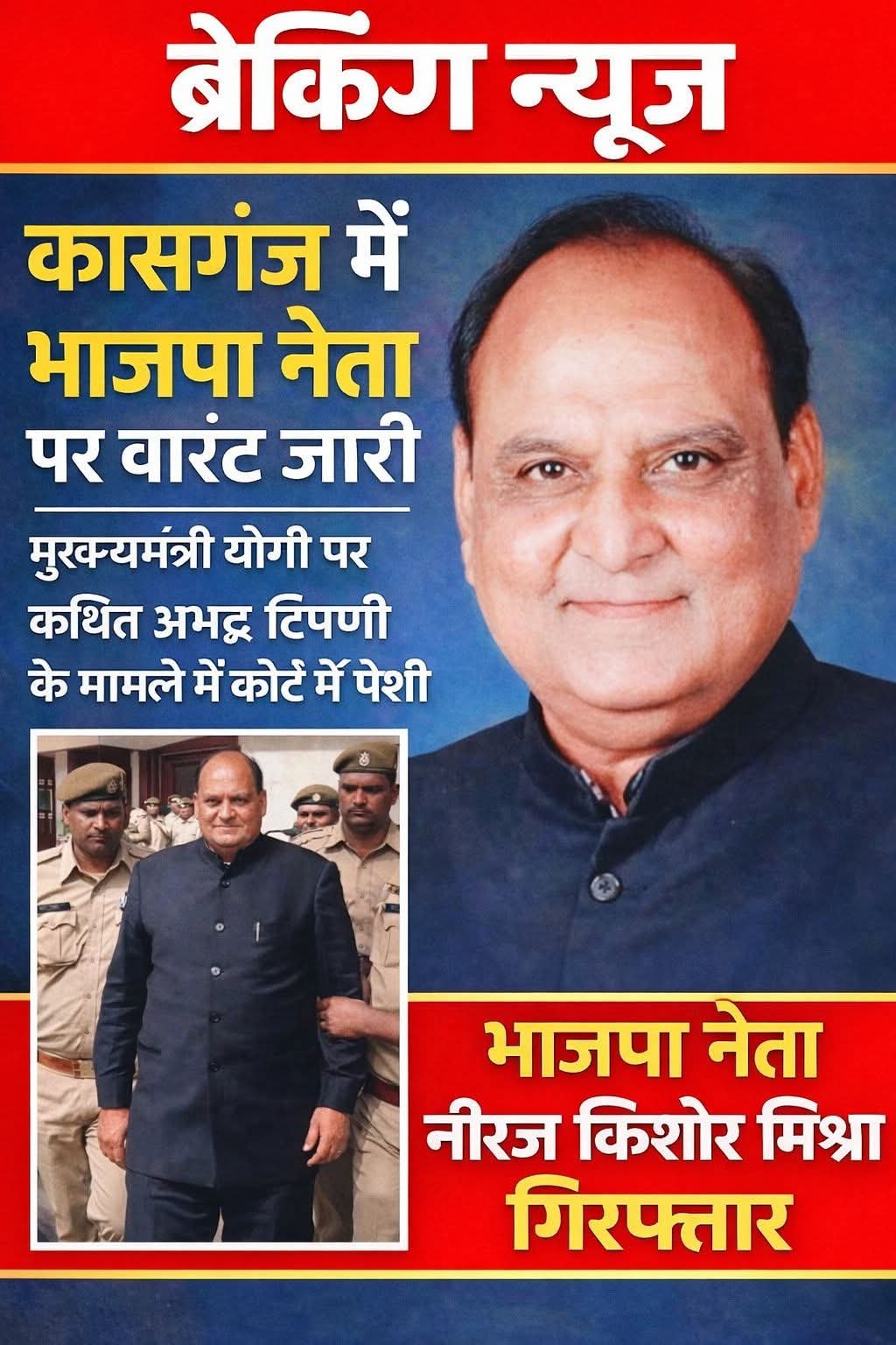 जनपद कासगंज के पटियाली क्षेत्र में मुख्यमंत्री योगी आदित्यनाथ पर कथित अभद्र टिप्पणी से जुड़े मामले में भाजपा नेता और पूर्व उच्च शिक्षा आयोग सदस्य नीरज किशोर मिश्रा के खिलाफ न्यायालय द्वारा जारी वारंट पर पुलिस ने कार्रवाई की। पुलिस ने उन्हें गिरफ्तार कर अभिरक्षा में जनपद न्यायालय में पेश किया। पुलिस सूत्रों के अनुसार वर्ष 2021 में पटियाली कोतवाली में नीरज किशोर मिश्रा के खिलाफ मुकदमा दर्ज किया गया था। प्रकरण में न्यायालय से वारंट जारी होने के बाद पटियाली पुलिस ने उन्हें हिरासत में लिया और आवश्यक विधिक प्रक्रिया के तहत कासगंज न्यायालय में प्रस्तुत किया। पटियाली थाना प्रभारी निरीक्षक लोकेश भाटी ने बताया कि न्यायालय के आदेश का पालन करते हुए यह कार्रवाई की गई है। आगे की कार्यवाही न्यायालय के निर्देशानुसार जारी रहेगी। राजनीतिक सफर भी रहा उतार-चढ़ाव भरा नीरज किशोर मिश्रा का राजनीतिक करियर भी चर्चा में रहा है। वे पहले बसपा और सपा से जुड़े रहे, बाद में भाजपा में शामिल हुए।